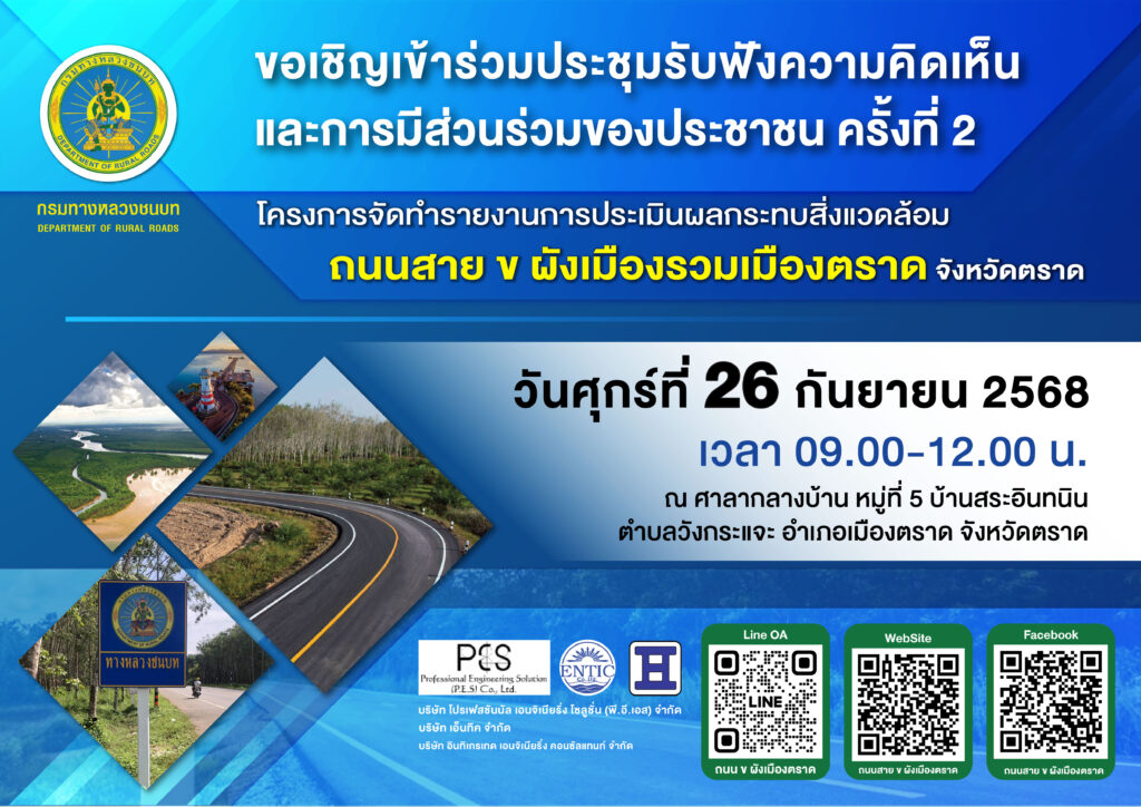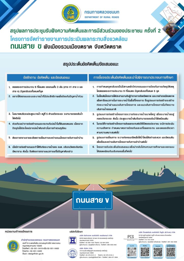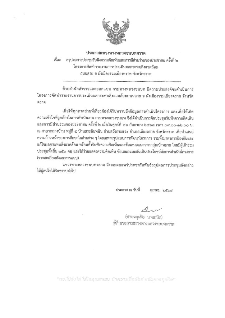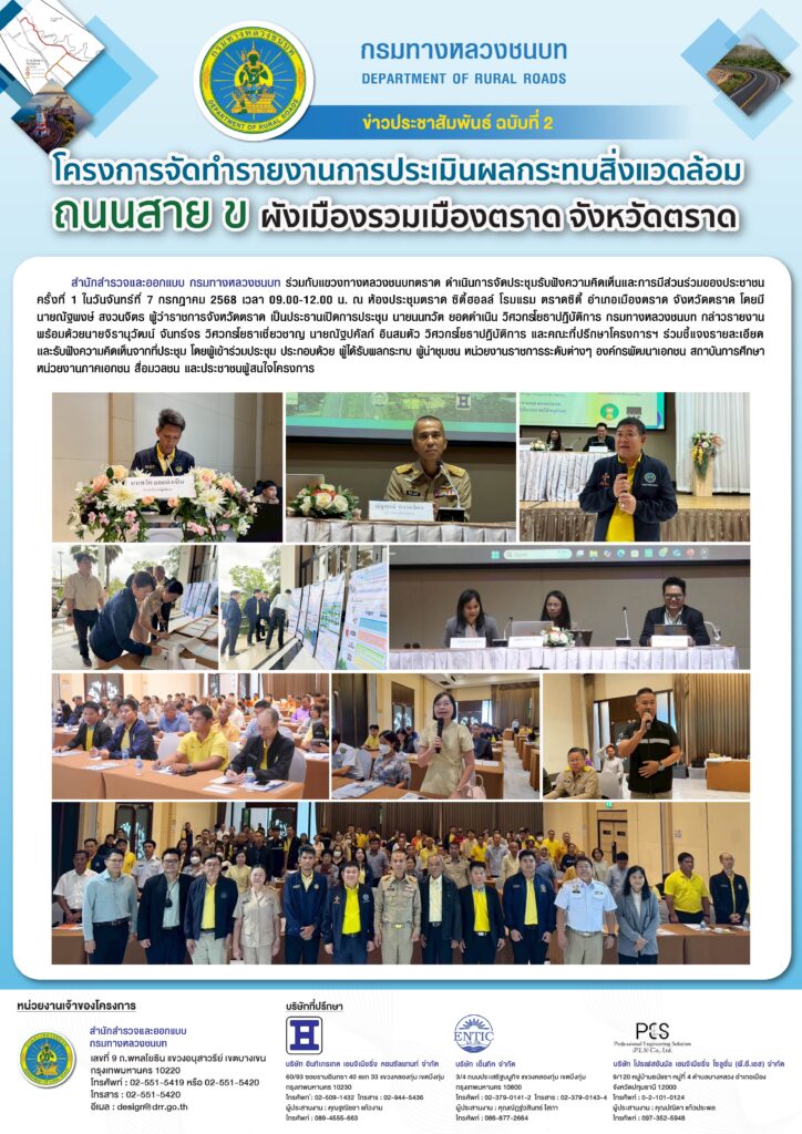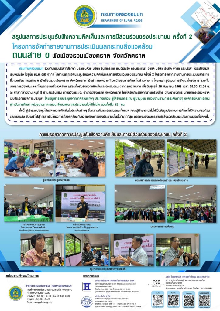 ได้ดำเนินการจัดประชุมรับฟังความคิดเห็นและการมีส่วนร่วมของประชาชน ครั้งที่ 2 โครงการจัดทำรายงานการประเมินผลกระทบสิ่งแวดล้อม ถนนสาย ข ผังเมืองรวมเมืองตราด จังหวัดตราด