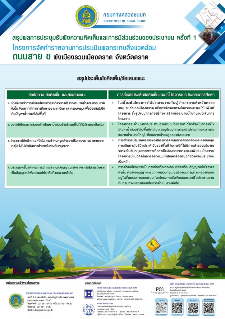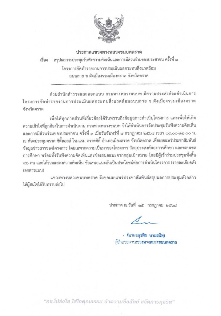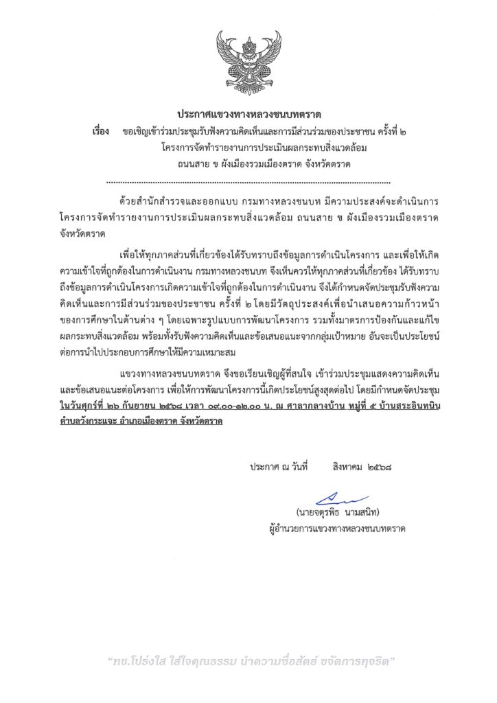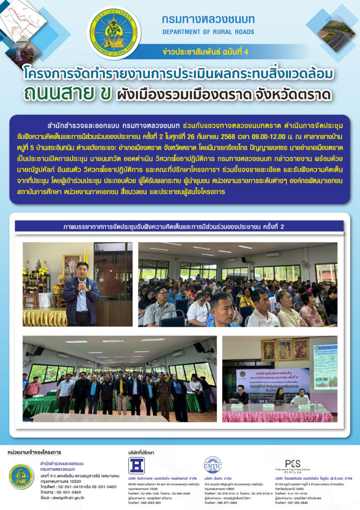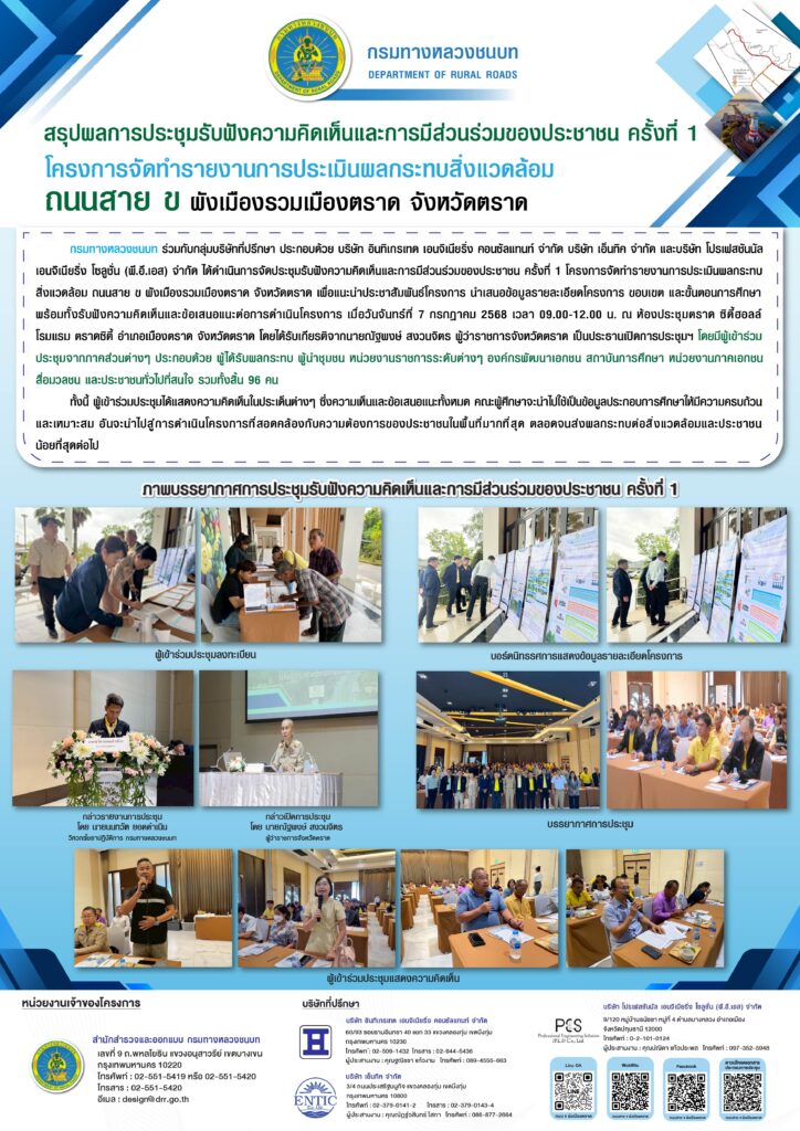 ได้ดำเนินการจัดประชุมรับฟังความคิดเห็นและการมีส่วนร่วมของประชาชน ครั้งที่ 2 โครงการจัดทำรายงานการประเมินผลกระทบสิ่งแวดล้อม ถนนสาย ข ผังเมืองรวมเมืองตราด จังหวัดตราด